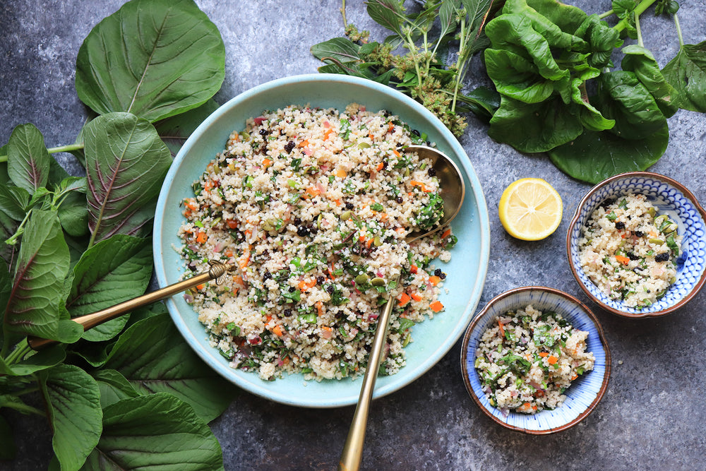 This summer, I decided to start a small vegetable and flower garden in my backyard. I planted tomatoes, peppers, herbs, and fennel, most of which, despite a summer of almost no rain, grew into healthy plants. I hovered over them like a new parent, moving them around to get the right amount of sun or shade. Some, like delicate herbs did not survive the harsh heat but the star of the garden turned out to be two innocuous looking amaranth plants a farmer at the weekend market persuaded me to buy. The drought resistant amaranth grains have been cultivated for millennia by the Aztec and certain parts of Asia and I have often bought the red tinged amaranth greens at Indian or Asian markets. The little plants blossomed quickly into tall gangly stalks, spread their seeds and I now have a mini amaranth farm in my backyard, bursting with bright green leaves, just waiting to be picked. Knowing the power of eating greens, daily, I look for ways to add it to my meals from stirring it into a curry, dal, salad, or a pilaf.
