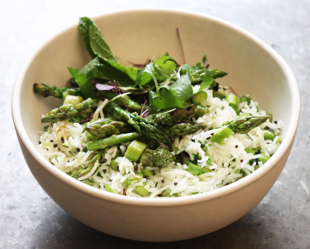 Asparagus, synonymous with spring, grows well in coastal climates, has an extensive culinary history and is exceptionally nutritious. There are recipes from the Roman Empire in some of our earliest recorded cookbooks, amorous for asparagus. In the culinary world, asparagus at one point was a delicacy, but now with global farming and distribution, it’s considered commonplace and reserved as an accompaniment.To showcase this lovely vegetable, I wanted to bring out not only its earthy qualities but its delicate woody bitterness. Pairing with creamy navy beans — that are brightened with citrus and popped spices — lends substantial flavor and a wonderful juxtaposed texture to the al dente asparagus. This dish is a nutritional powerhouse, packed with dietary fiber and many essential vitamins. I could eat this as an entrée all to myself.