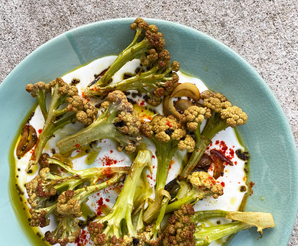 For the last few weeks, I’ve been spotting tiny little butternut squashes at the farmers market at various tables from Plant-it -forward to the smaller individual farmers to Animal Farm in Cat Springs, Texas. Knowing that butternuts are nutritional powerhouses of essential vitamins, minerals, and antioxidants, not to mention how delicious they are, I brought a few home, cut them in half and simply roasted them in the oven, cut side up with olive oil, salt, and cumin seeds. They are fresh, tiny, and tender, about the size of an apple and the knife slides right through them. For a larger butternut, I’d discard the seeds along with the stringy tissue around it but with these little beauties, I leave them in. Less than an hour later, I devour these shockingly delicious squashes, seeds, and all, with golden brown edges, and a just a squeeze of lemon juice. But there is so much you can do with these! Top them with yogurt, cheese, tahini, peanut butter, herbs or nuts and seeds of your choice. Here I make a masala with caramelized onions and top them with an herbed yogurt sauce. Go look for these little butternuts before they are gone for the season!