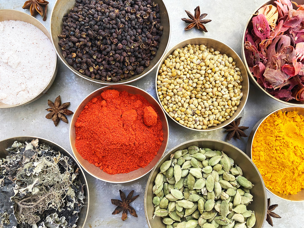 A handmade spice box containing red chile, turmeric, black pepper, cumin seeds, mustard seeds, amchur and garam masala.