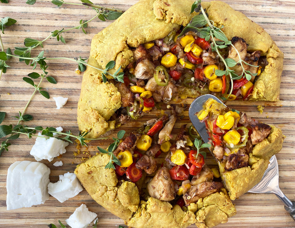 When Owen brought me dewberries this week, I wanted to do something special with them — so here is a galette that is more of a meal than dessert. It’s my favorite kind of food_ crisp, creamy with a serrano pepper kick and a slightly sweet tart topping of dewberries. Enjoy it for lunch with a crisp salad and a chardonnay.
