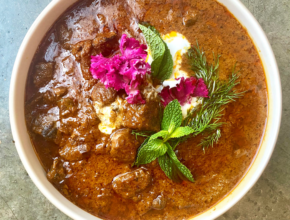 A handmade spice box containing chai masala, fennel seeds, coriander seeds, whole black peppercorns, whole green cardamom pods with a few black cardamom pods, garam masala, mace pods and nutmeg.