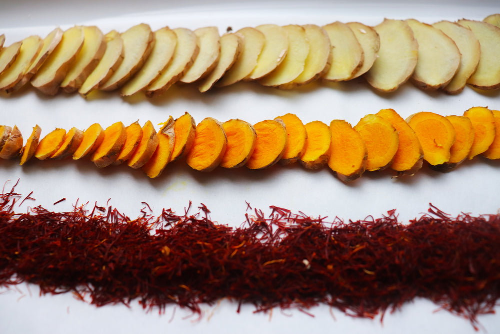 This pilaf was made using Carolina gold rice, a flavorful short grain rice that takes a little bit longer to make than basmati rice. Fragrant cinnamon and saffron balance the pungency of the fresh turmeric.