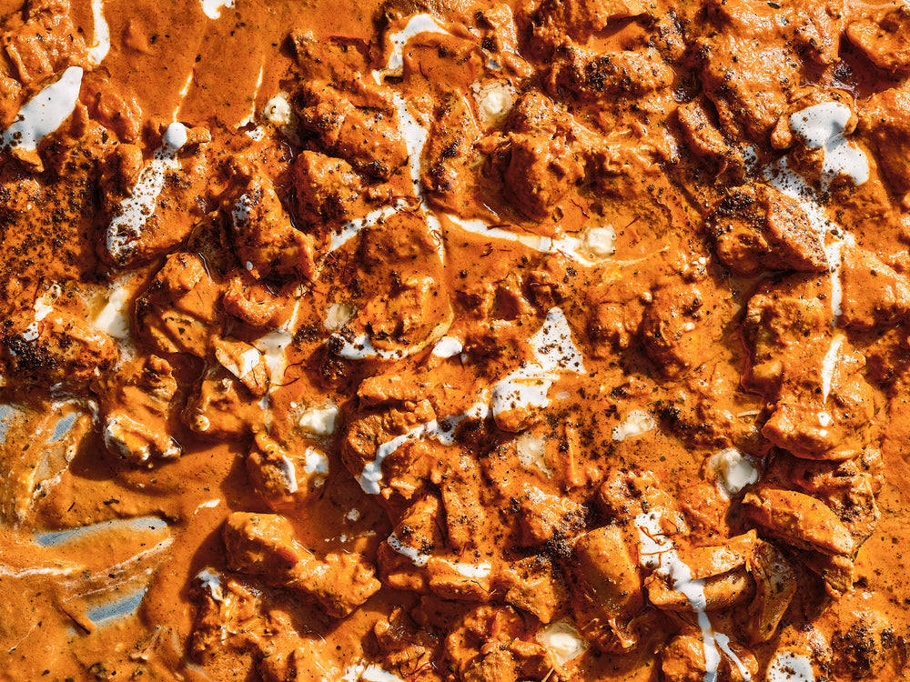 Though there is some controversy about the origins of the dish, the most likely story is that the modern version was created during the early ’70s by an enterprising Indian chef near London. In a quick attempt to fix a dry chicken tikka sent back by an upset customer, he whipped together a can of Campbell’s tomato soup, cream and spices to provide a sauce for the offending chicken. Of course, this unknown chef, who received no credit for his ingenuity, inadvertently had invented a dish that Britons now eat upwards of 20 tons of in a week. Originally dismissed as “mongrel cuisine,” in the hands of a skilled cook, butter chicken has evolved with periodic improvisations as a popular curry all over the world.