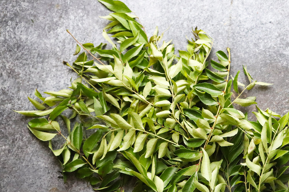 Sometimes called curry leaves, but not what curry powder is made of... Kari leaves are an intensely aromatic & warm, smaller than a bay leaf & deep green in color. They are delicious when fried and added to soups, chevdas or to garnish a curry or salad.