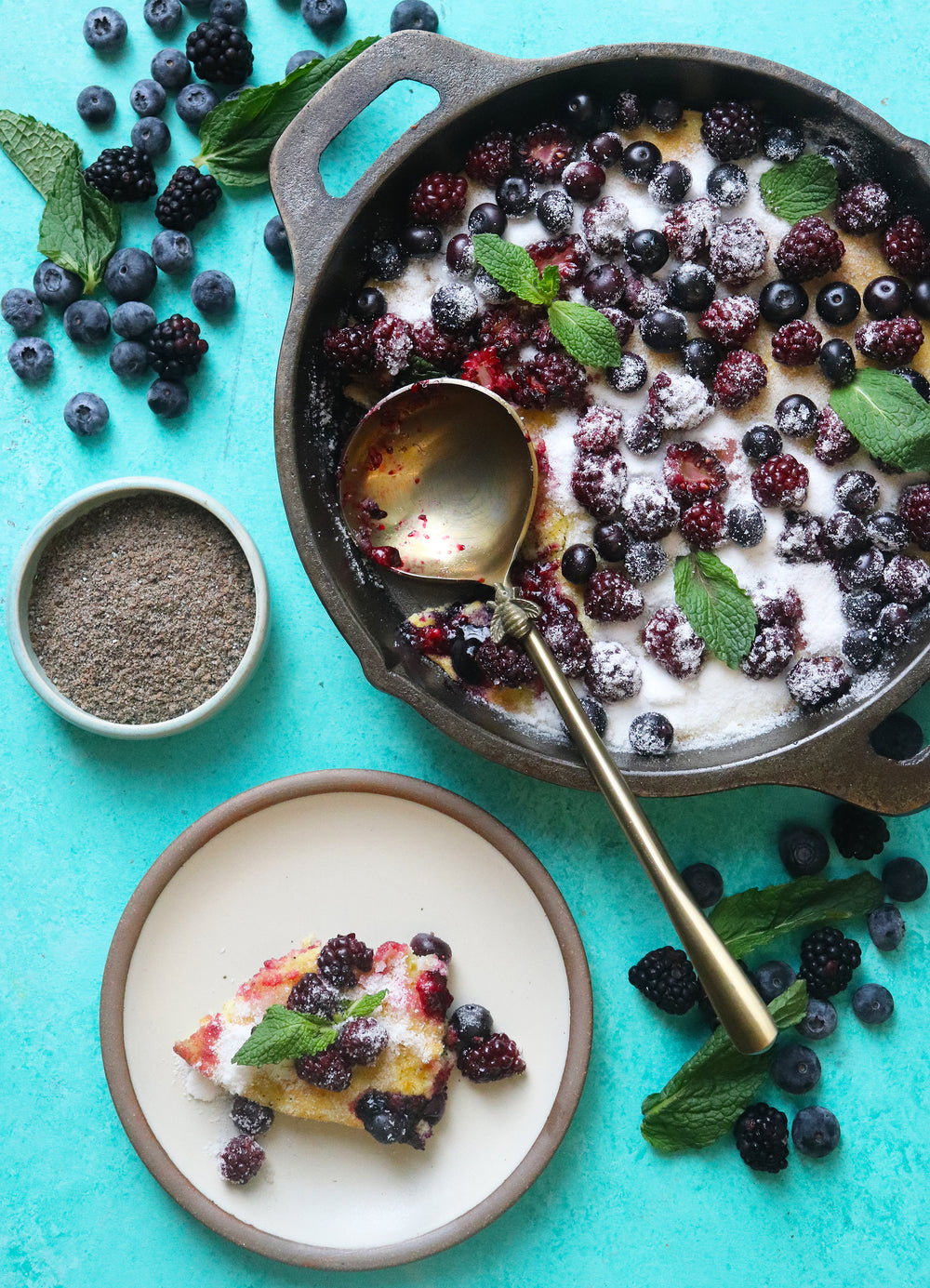 - Firm, unripe peaches work best. Figs, nectarines, or other berries can replace the peaches and blackberries. Just try to not pick fruit with too much liquid or the cake might become soggy.