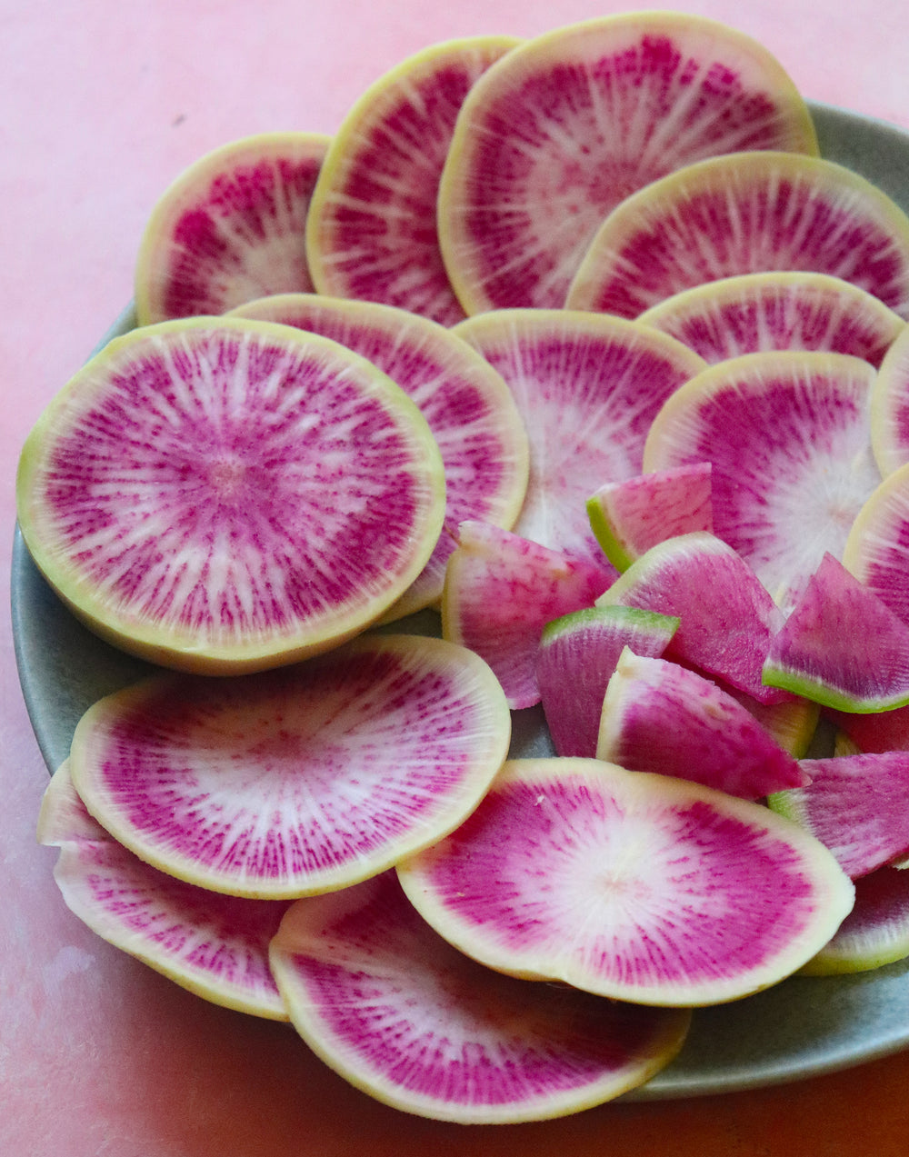 Recently, seeing the plethora of gorgeous colorful radishes on farm stands at the market, I decided to experiment with a radish roti. Paratha, a rich, layered flatbread stuffed with spiced grated radish (or mooli, as we call it in Hindi) is popular in the northern province of Punjab, India. A roti is a simpler daily bread, and white daikon or bright pink watermelon radishes can easily be substituted for the purple.