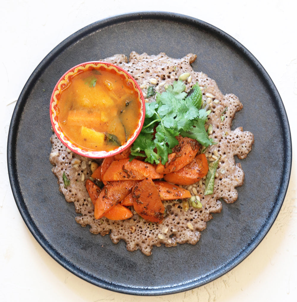 These glorious multicolored organic carrots from Animal Farm roasted with cumin seeds, toasted sesame oil and a sprinkle of sesame seeds on top can be enjoyed just on their own or tossed into a salad or pilaf. Serve them warm with a drizzle of honey. Don’t discard the carrot greens; they make a great addition to a salad or stir-fry.