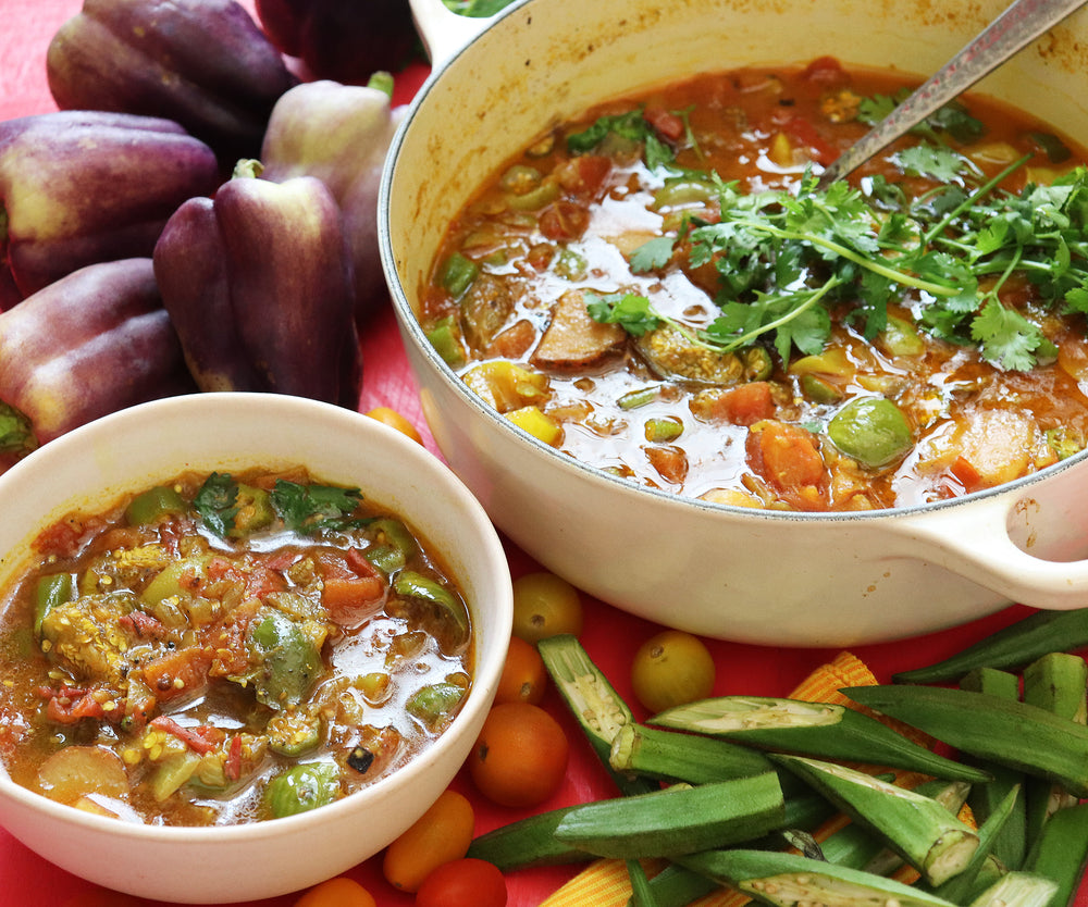 - Any seasonal vegetables will do. Feel free to replace the eggplant and peppers with squash and the okra with green beans or asparagus.