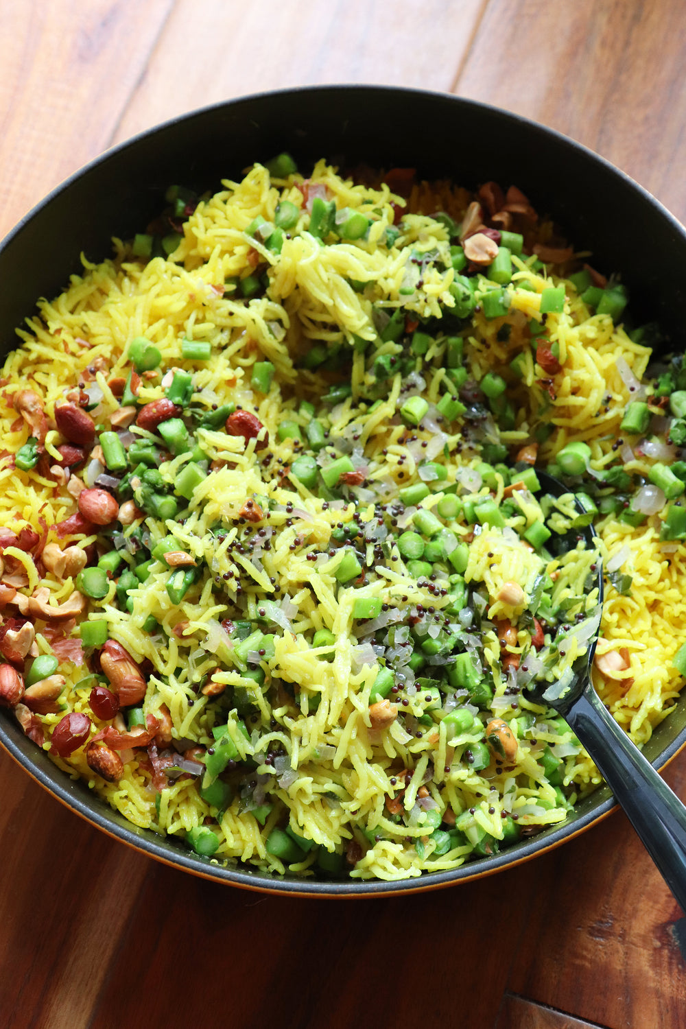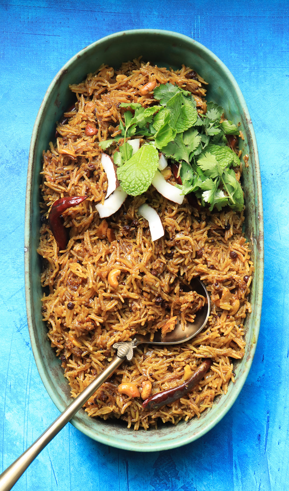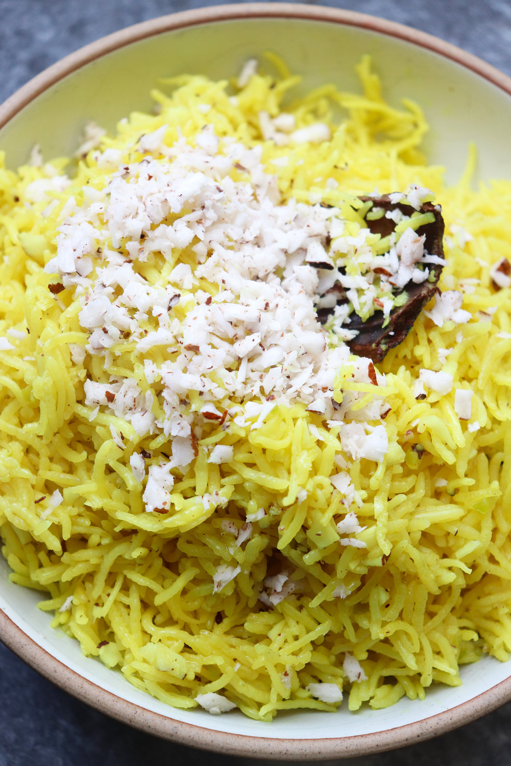 This pilaf can be a meal in itself, however, when paired with a creamy curry, it makes for a winning combination. Fresh tomatoes are delicious in the pilaf, but in the winter, canned crushed tomatoes also make for a wonderful pilaf.