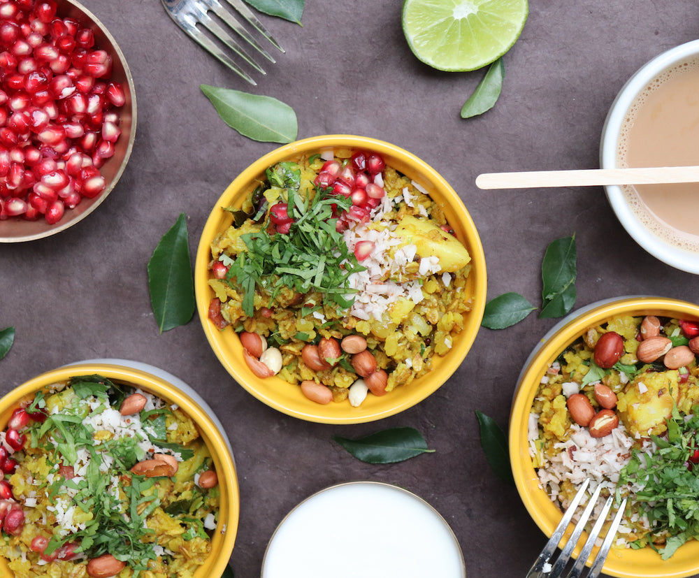 Across India, from slums to construction sites all the way up to fancy homes, a flattened rice dish by the simple name of “poha” is a wildly popular breakfast and snack staple. Different varieties of rice are parboiled, rolled and flattened to produce flakes. These bland flakes can absorb moisture and imbibe a variety of flavors, like turmeric, ginger, mustard seeds — within minutes transforming into a simple one-pot meal.