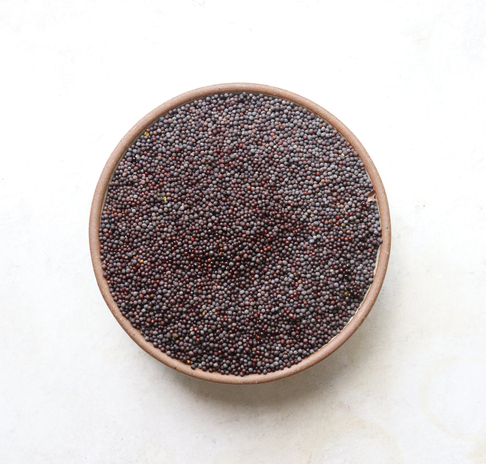 Quoted in biblical writings from the Bible to the Koran, the tiny mustard seed, sourced from a brassica family with no connection to supermarket mustard greens, is packed with a pungent flavor. There are three kinds of mustard seeds, yellow, brown and black and the flavor is only released when the seed comes in contact with cold water, setting off an enzyme myrosinase that unleashes the flavor. Best purchased whole, mustard seeds will keep for years. Black mustard seeds are the ones most commonly used in India and my favorite way to cook them is to pop them in hot oil at the beginning of cooking curries, stews or pilaf. The two kinds of mustard seeds I keep at the home pictured above are whole black mustard seed and ‘rai kuria’, crushed black mustard seeds with the skin removed. Mustard oil, cold-pressed from brown or black mustard seeds is very common in India, particularly in Bengali cooking. It has some of the properties of wasabi with nose and head warming hotness. While medical studies are inconclusive, due to a high percentage of irritants like erucic acid and isothiocyanates, for years sale of edible mustard oil was banned in Western markets and was sold under the guide of ‘massage oil’. These days, however, it is freely available at Indian grocers. When I bring a bottle home, I usually heat it to smoking point, cool and store it in a glass jar. I can drizzle it on salads or curries and use it to make salad dressings. In India, where mustard oil has been used for millennia, heating the oil to a smoking point is believed to eliminate the irritant chemicals. Mustard seeds are believed to be a diuretic, a stimulant, help improving digestion, increasing circulation and easing muscular aches and pains.