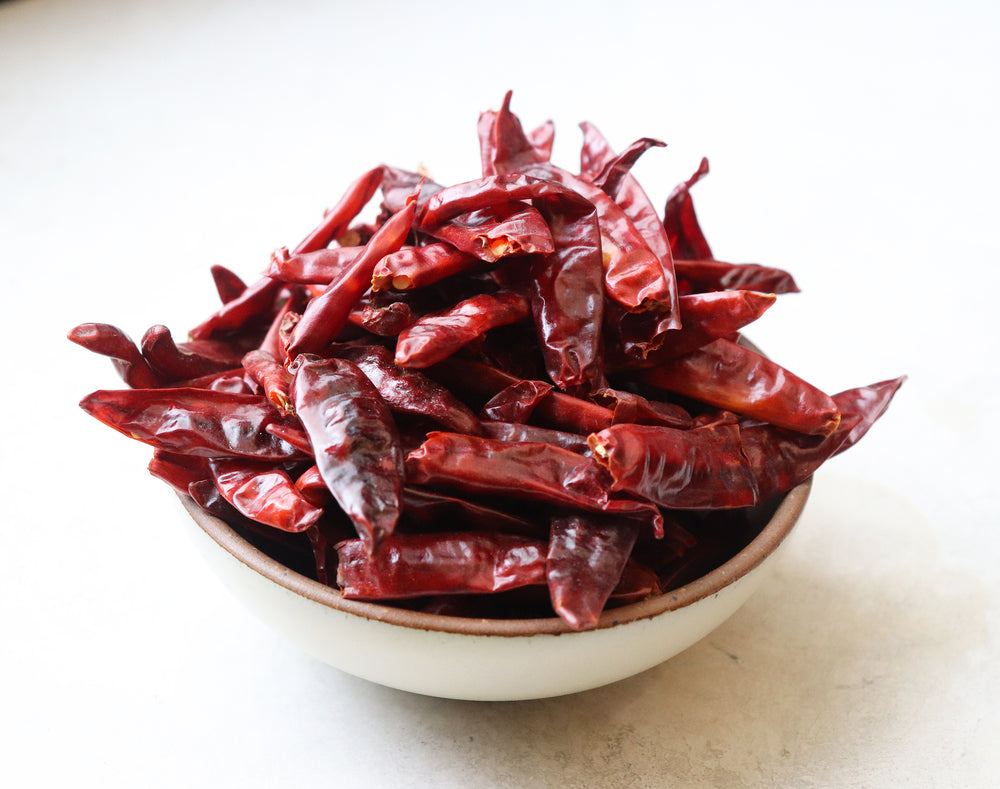 Red chiles are integral to the cuisine of India and mostly, whole red chiles are used for popping stews or dals or toasted and ground in a masala. Similar to the arbol chile of Mexico, the whole red chiles are grown in the southern state of Andhra Pradesh, India.